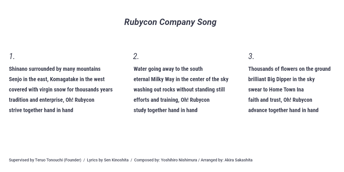1962年作为公司政策制定了创业理念。 它是在我们公司成立十周年之际,为的是让所有员工团结起来,追求更高的目标而制定的。 Rubycon的创业理念和精神,融合了我们公司的创始人以及前辈们的思想,构成了Rubycon经营理念的基础。
