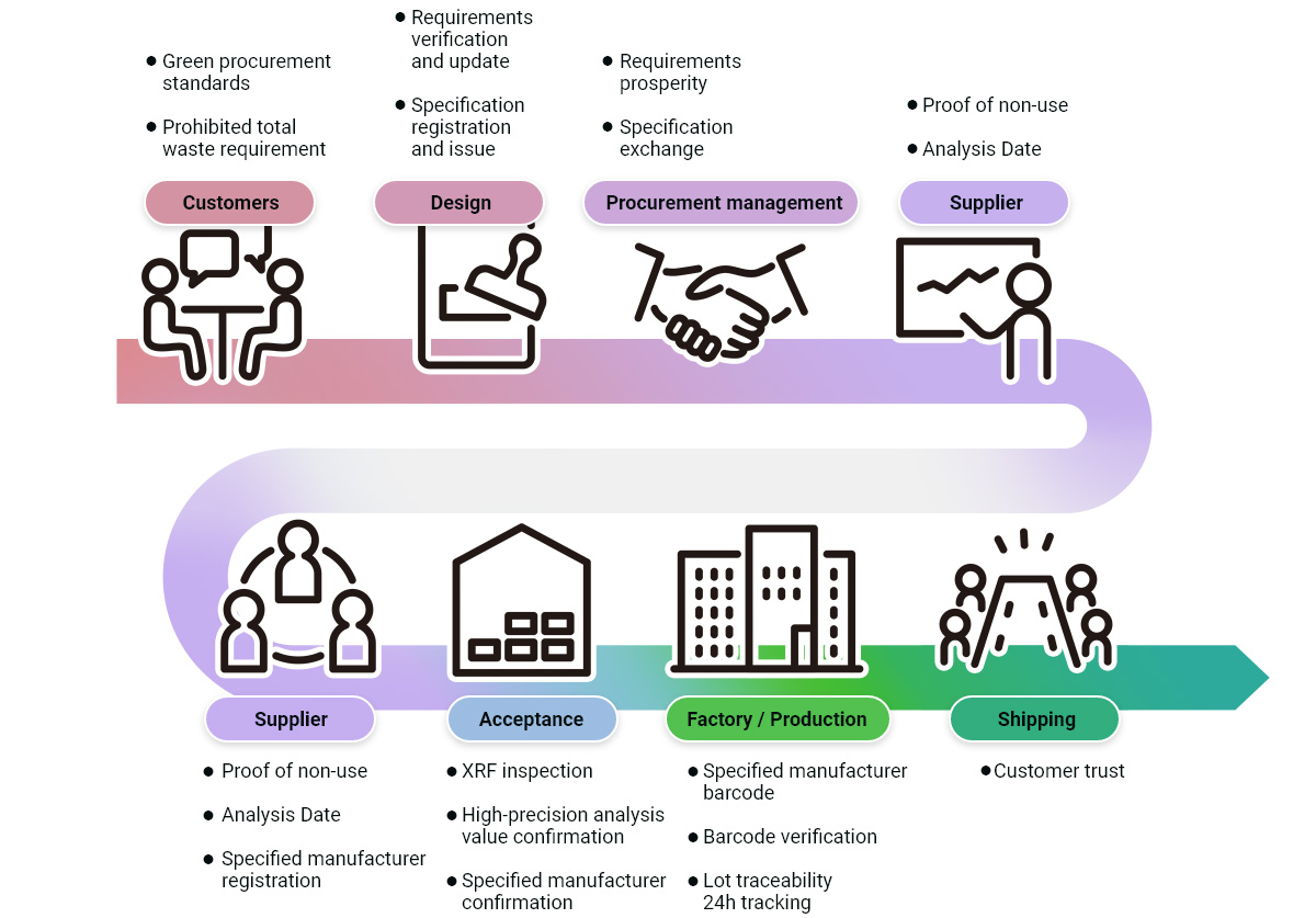 收进材料时,要确立对于RoHS规制物质进行XRF分析等的高精度分析数据值的确认体制,并将纳入全材料贴上二维码标识来识别,彻底的实现追溯管理。
