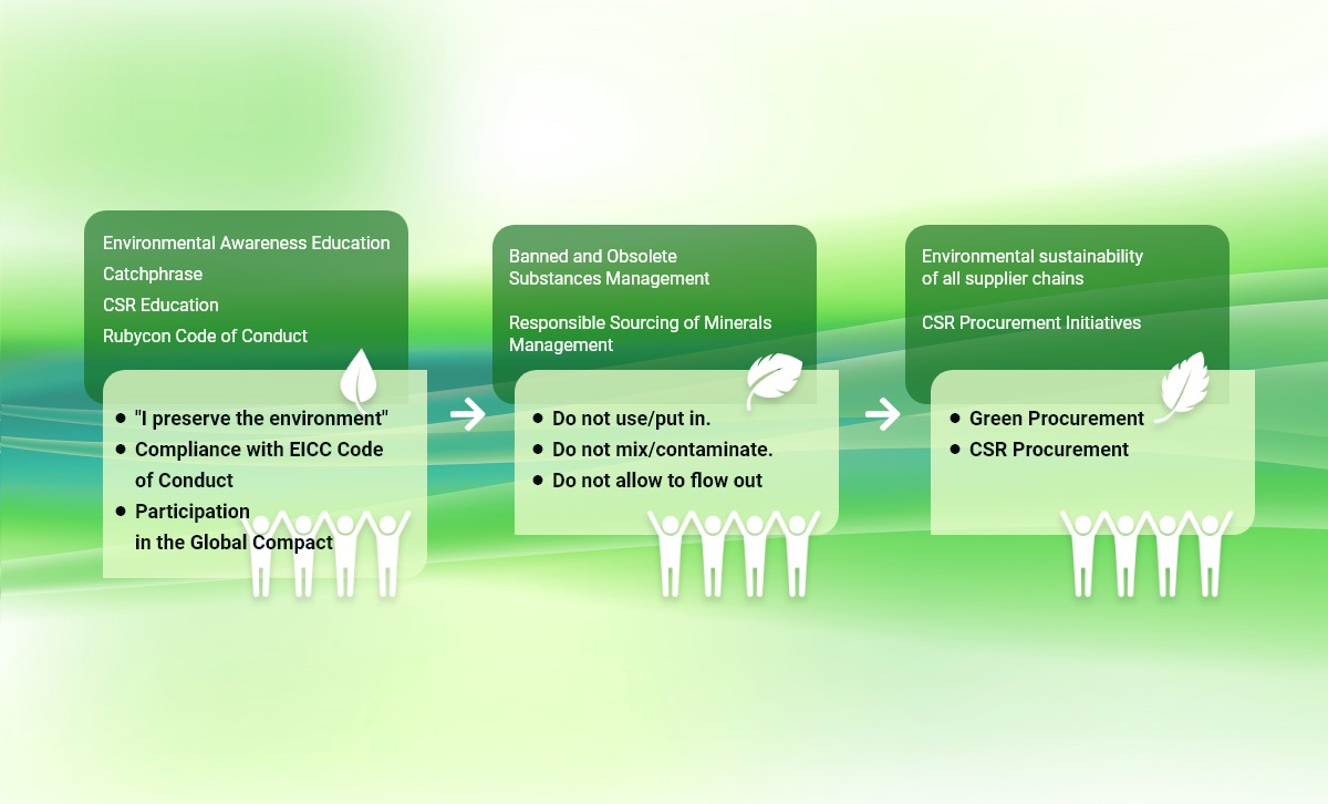 以采购方针「我来保护地球。」为口号得到了客户和社会的信任,为了提供让顾客满意的产品,供应链全体都在持续着遵纪守法,CSR采购,绿色采购,对有冲突的矿物质负责的进行采购等活动。