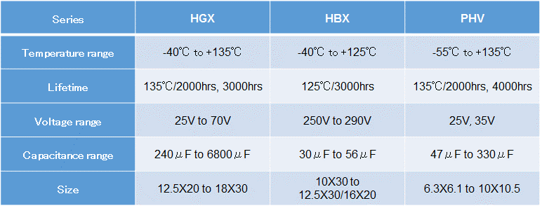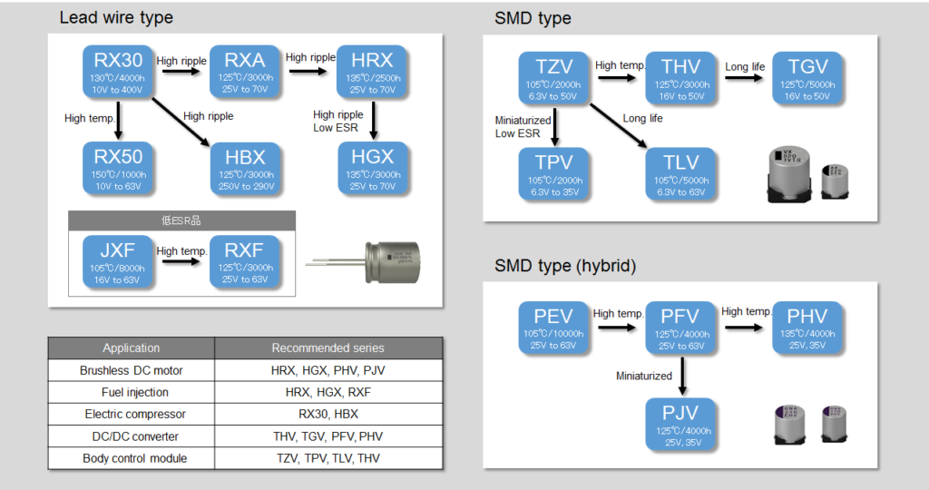 The PHV series with high heat resistance and ripple current has the potential to downsize any ECU such as DCDC converter and brushless DC motors.