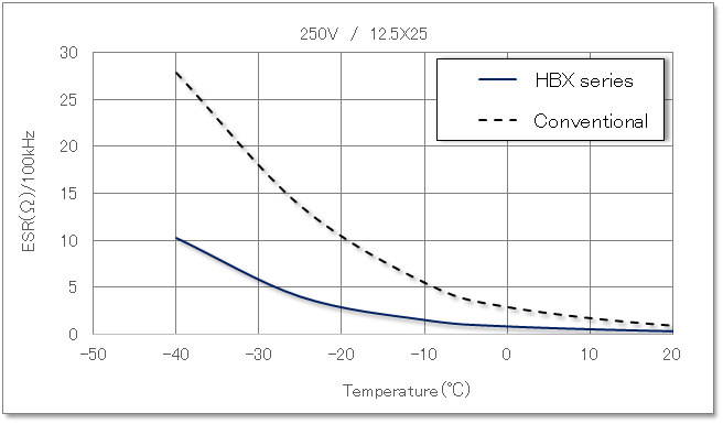 The HBX series is a product developed for DC link of high voltage inverter drives specializing in high heat resistance and ripple current with a rated voltage of 250 to 290 Volts DC. It has top performance in terms of low temperature characteristics and heat resistance. This series has a high market share in the electric compressor market for automotive air conditioners, and further demand expansion is expected with the growing market of electric and plug in hybrid vehicles. Electric compressors are required to operate under high stress and high temperature conditions with the ability to thrive in extremely cold regions. For this reason, the HBX series offers the highest level of ripple current at the upper category temperature of 125ºC and far lower ESR at -40ºC than other conventional products. This is achieved through the adoption of a special electrolyte that has been designed for a high heat resistance along with low temperature performance. This in combination with a low resistance separator paper are what is used to achieve such high performance. (Fig. 2)
