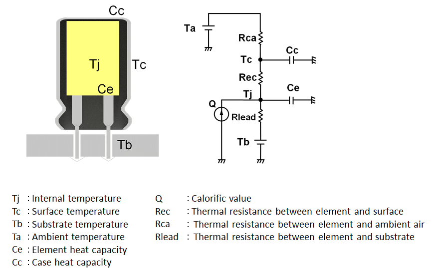 The life of an aluminum electrolytic capacitor is primarily defined by the ambient temperature and self-heating due to the applied ripple current. To properly estimate life, an accurate measurement of the internal temperature is especially important for under hood and powertrain applications where high temperature and ripple are common. We have conducted extensive thermal conductivity analysis of each capacitor by utilizing a finite element method. We then create an accurate thermal equivalent circuit model (Fig. 3) by comparing and adjusting it with experimental data. It becomes possible to estimate the internal temperature of the capacitor assuming the actual use environment by incorporating the mounting conditions (thermal parameter) presented by the customer into this thermal equivalent circuit model. It becomes possible to prevent overheating of the capacitor and avoid excessive design through this method. As a result, this process contributes to downsizing, weight and cost reduction through proper capacitor selection.
