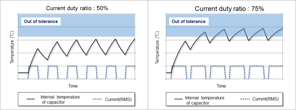 Capacitors for automotive ECUs such as electric power steering and fuel injection applications are often required to cope with short-term high current. This typically exceeds the rated ripple current specification of the capacitor. In this case, not only the peak current value but also current duty ratio is key to estimate the heat generation due to the ripple current. This is because the actual temperature inside the capacitor largely depends on the current duty ratio. The difference in the actual internal temperature of the capacitor caused by the difference in current duty ratio is shown in Fig. 4.