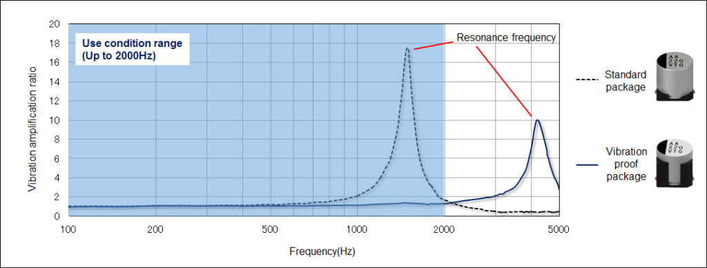 Capacitors for automotive use are required to survive vibrations in excess of 20 G peak amplitude due to the mounting on or near engine and the advancement of mechatronics integration. However, since the resonance frequency of a surface mount capacitor with a standard structure exists within the vibration frequency range (about 5 Hz to 2000 Hz) used for automotive device unit, the capacitor will fail by amplified vibration amplitude at the resonance frequency. Therefore, it is important to bring the resonance frequency of the capacitor beyond the range of the use conditions. Figure 5 shows the frequency characteristics comparison of the vibration amplification ratio of the vibration proof package with the standard package. The resonance frequency of the vibration proof package shifts from 1500 Hz of the standard package to 4200 Hz, and the vibration amplification ratio of the vibration proof package can be suppressed to 2.0 or less within the supposed frequency range. Package improvements have made for remarkable progress on vibration resistance with performance up to 30 G or more.