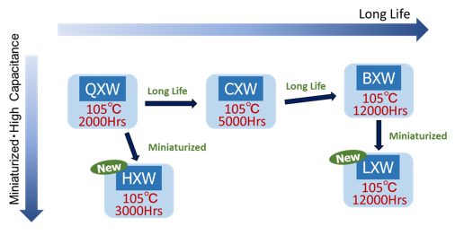 This article introduces 3 key points such as Miniaturization, Low Temperature Characteristics and Life Prolongation which were focused as essential technical elements in R&D of HXW and LXW series.