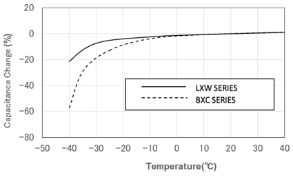 Figure 3 is a graph comparing the capacitance change rate of the two series at low temperatures. Our conventional BXC series exhibits a rapid drop of its capacitance at -15ºC and our LXW series using a newly developed electrolytic solution has an electric resistance value which is more stable in a low temperature environment- even as low as -30ºC.