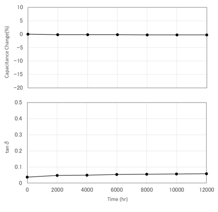 Rubycon has accumulated its know-how of electrolytic solutions development over 50 years and has a number of achievement records in the field of long-life characteristic improvement of capacitors for LED lights for example. Electrolytic solution of our LXW series have been developed with the objective of lower resistance value and higher stability of electric characteristics of the solution in the environment of longer time of use in a higher temperature. Figure 4 exhibits high temperature load test results (Rated Ripple Voltage Superimposed) of our LXW series at a temperature of 105ºC.Even after an interval of 12,000hrs it can be seen that there is not much difference in electric characteristics, which results in performance stability.