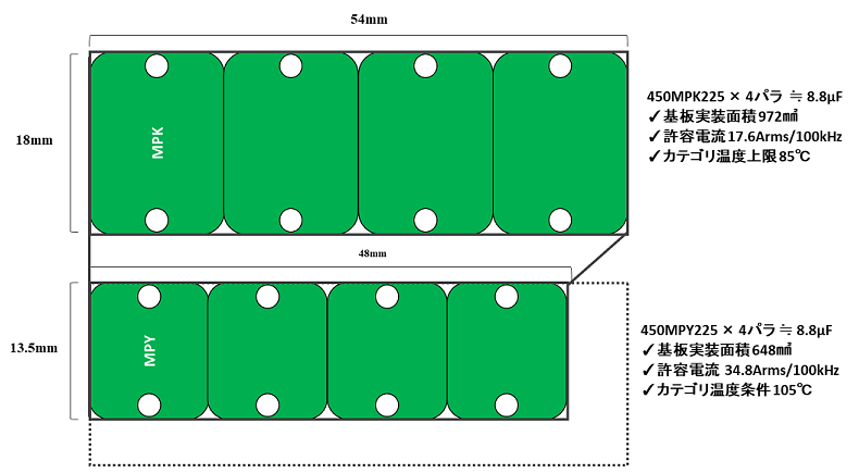 弊社では大電流負荷保証が求められる産業用電源をターゲットとして、実装面積が小さく許容電流を大幅に向上させたフィルムコンデンサ「MPYシリーズ」を開発しました。