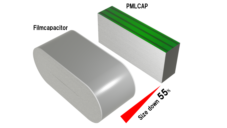 PMLCAPは高分子を当社独自の技術で多数積層したコンデンサで極めて理想的に近い電気特性を有し、従来のフィルムコンデンサの大幅な小型化が実現できます。