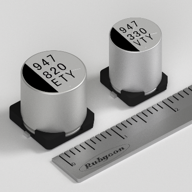 「TYV」は、面実装形で105℃ 8,000時間を保証したシリーズです。従来品の「TNV」シリーズ(105℃ 5,000時間保証品)同様に高容量化と低ESR特性を維持して、更に高性能電解液と高気密性の封止材との組み合わせ等により、105℃ 8,000時間保証を実現しました。 定格電圧は25V,35V 静電容量範囲は330~820μFを ラインアップします。