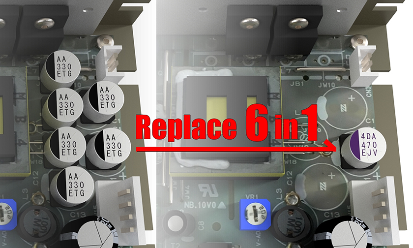導電性高分子アルミ固体電解コンデンサは従来のアルミ電解コンデンサと比較して非常に大きなリプル電流を流すことができます。一例として従来のアルミ電解コンデンサが6個必要だった箇所を同等性能で1個に置き換える事ができ基板上のスペースを大幅削減でき、機器の小型化に貢献できます。