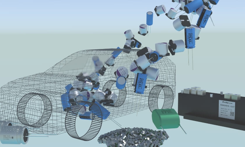 C (Connectivity) A (Autonomous) S (Shared & Service) E (Electric)化で車載への電子部品搭載数は年々増加しています。車両の電子部品コスト比率は、1980年代は約3%でしたが、近年では約40%にまで増加し、脱炭素化に伴うEV、FCVへの置き換えにより電気自動車では約70%と更に増加が見込まれます。ルビコンでは、導電性高分子アルミ固体電解コンデンサ(PZ-CAP)と共に従来のアルミ電解コンデンサも車載用途品の開発を進めています。